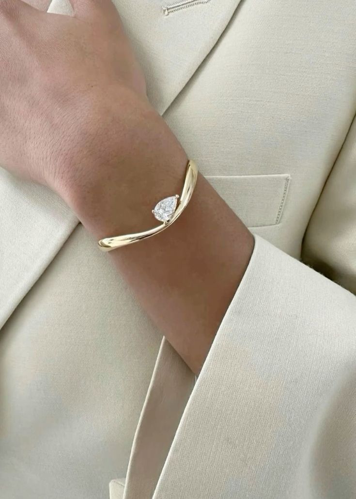 Sculpted in polished gold and crowned with a brilliant teardrop-cut crystal, the Aurora Crystal Arc Bangle is a quiet statement of luxury. It's fluid, asymmetrical design hugs the wrist like a second skin, effortlessly elegant and endlessly timeless.
