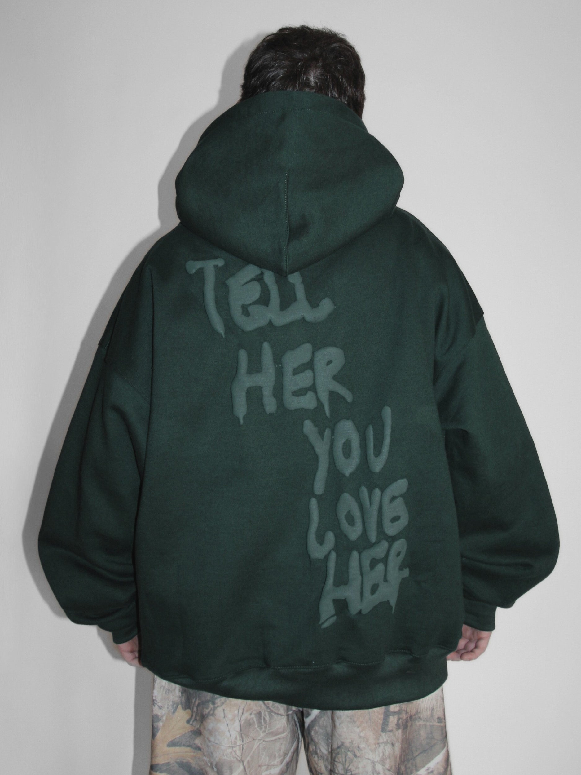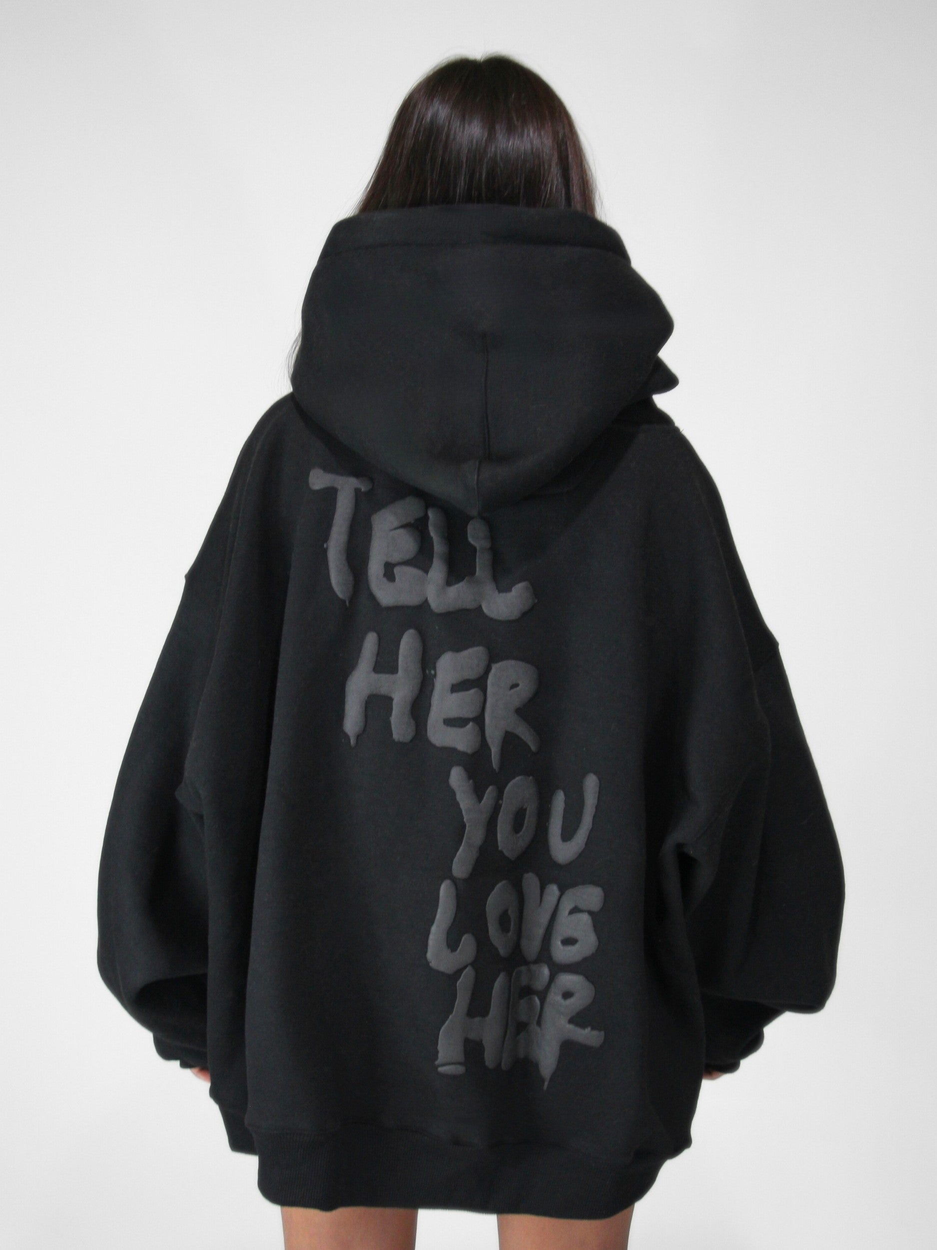 "Tell Her You Love Her" Hoodie makes a powerful statement with oversized comfort and textured 3D lettering that reads “Tell Her You Love Her.” This hoodie is equal parts cozy and unapologetically expressive, perfect for those who wear their heart on their sleeve.